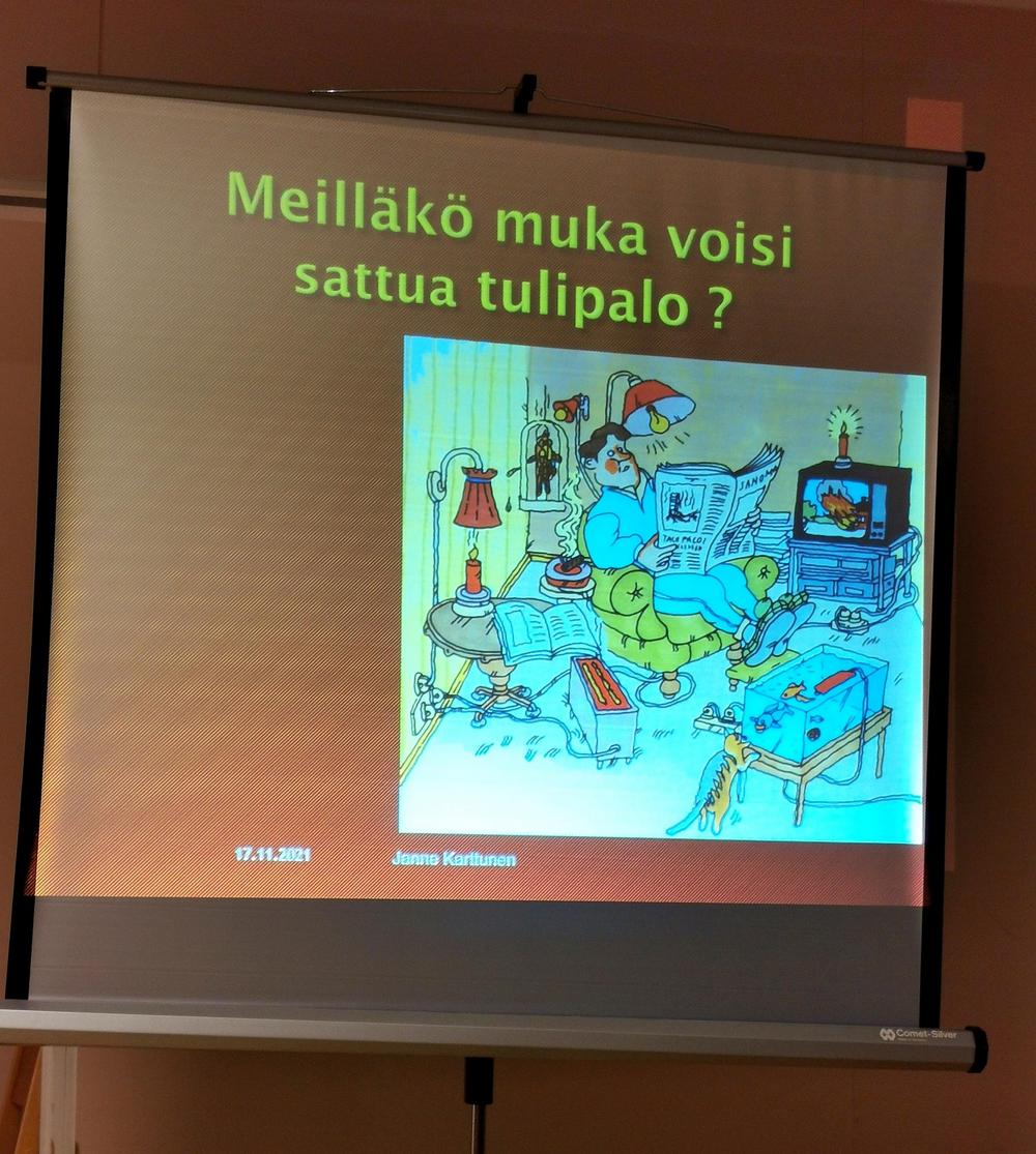 Marraskuun kuukausitapaamisemme aiheena oli Kodin paloturvallisuus. Mielenkiintoinen ja tärkeä aihe, josta meille kertoi elävästi ja vauhdikkaasti Satakunnan pelastuslaitokselta Ylipalomies Janne Karttunen. Hänellä on takanaan pitkä ura moneltakin saralta ja kokemuksen äänellä ja elävällä kertomistyylillään ’hän piti meidät hyppysissään’ kertomalla todella varteenotettavista seikoista ympäristössämme. Huomioitavia asioita mm. pidä palo-ovet kiinni – ei niistä muuten ole hyötyä; kulkutiet pidettävä vapaina; sauna ei ole varasto eikä kuivaushuone; palovaroittimet – sijoitus ja toimivuus; rikkinäiset sähkölaitteet ja -johdot; savu tappaa enemmän ihmisiä kuin tuli. Kuvat Oili Roine