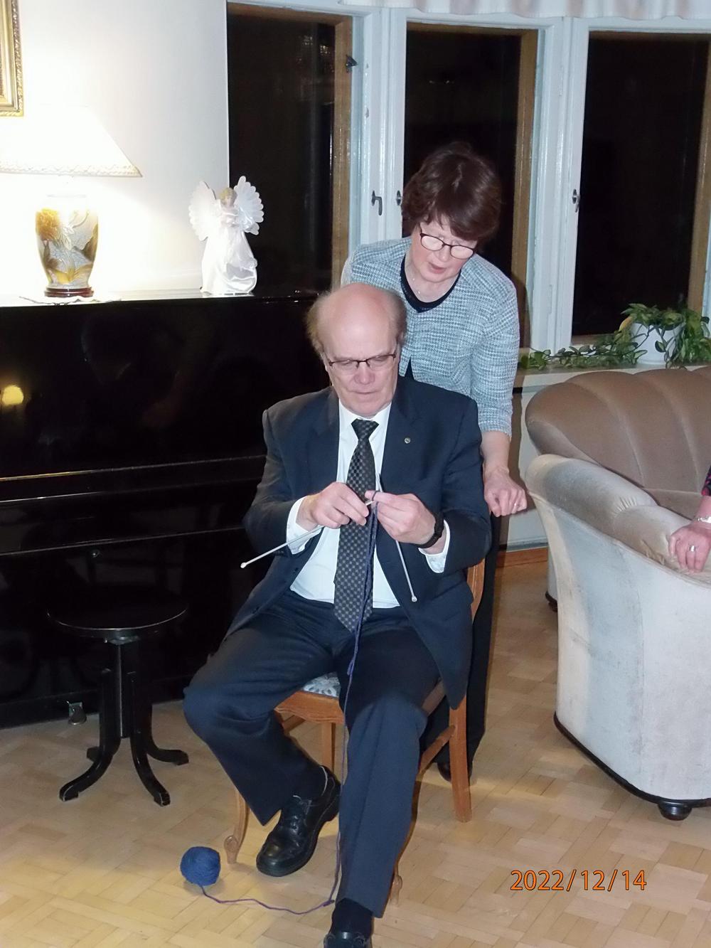 Seurasimme Kuusiston Kaijan vetämää opastustuokiota, jossa käsityökerholaisten piti opastaa puoliso/miespuolinen jäsen kutomisen saloihin... Ja sehän ei ollut mitenkään helppoa, kummallekaan osapuolelle. Käsis-kerhoon kelpuutettiin Pekka.