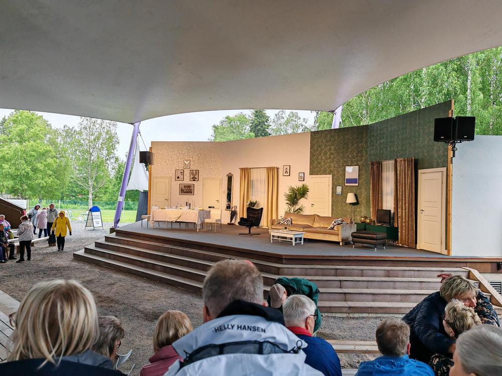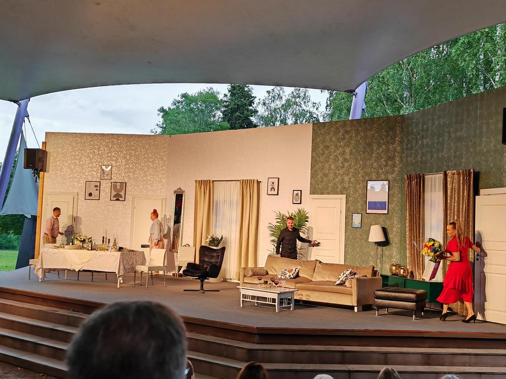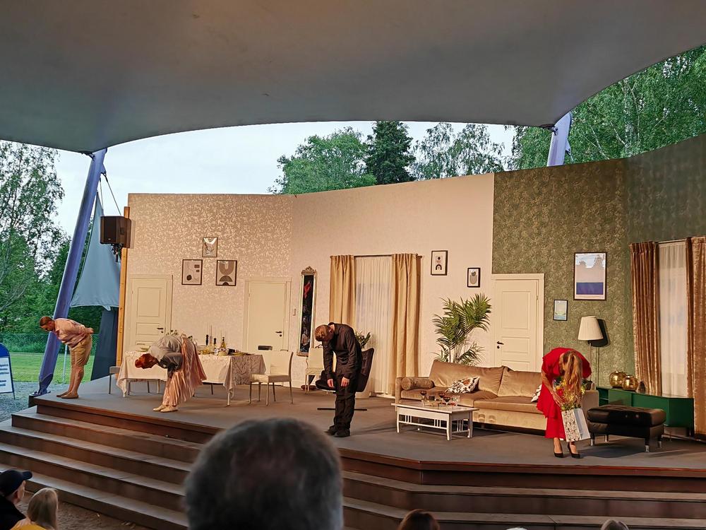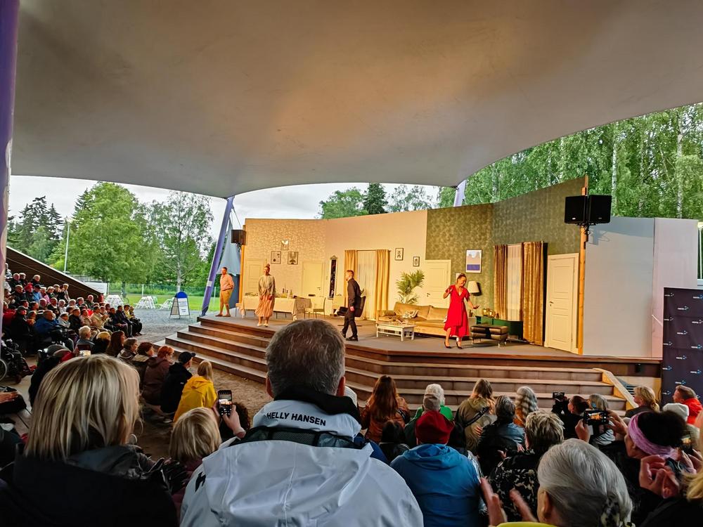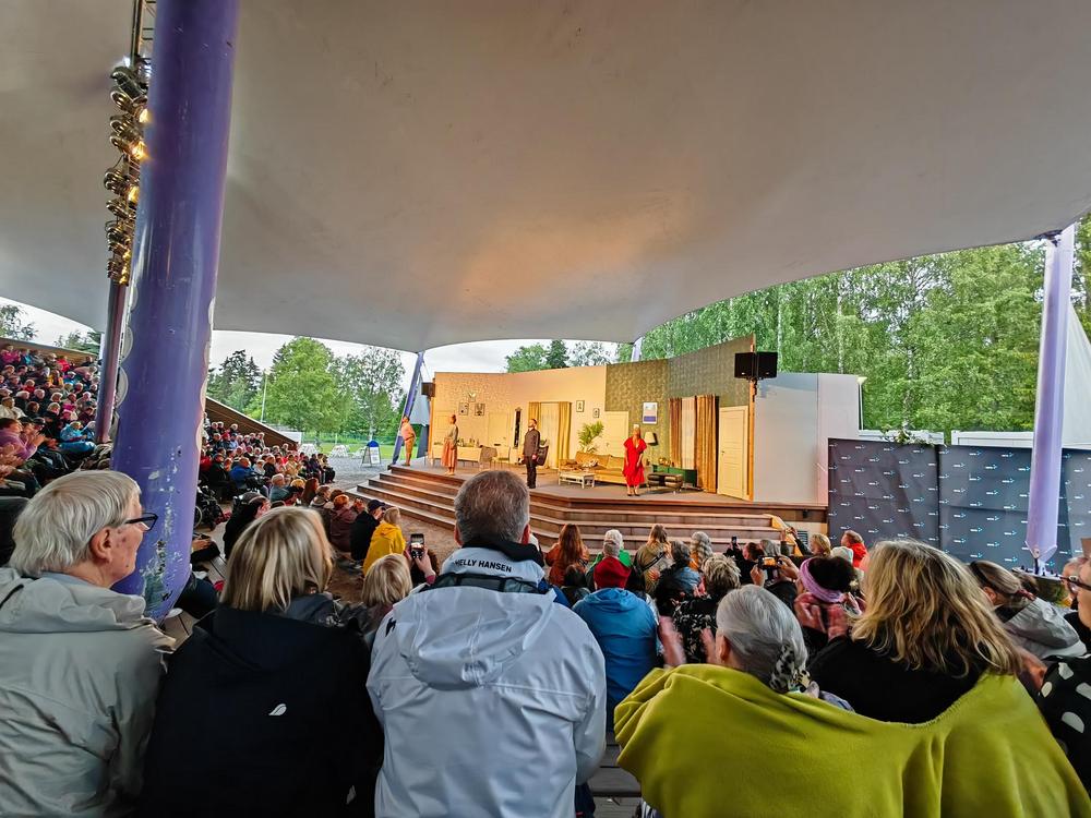 Kirjurin Kesäteatterissa esitettiin täysille katsomoille hauska parisuhdekomedia 'Vaimoni on toista maata'. Kävimme porukalla näytelmää katsomassa hieman koleassa ja sadetta tihkuavassa kesäillassa. Kokeneet ja tunnetut näyttelijät Jenni Kokander ja Joonas Nordman tähdittivät esitystä. Lisäksi mukana Marja Kuusiluoma sekä Miika Muranen, joka myös ohjasi esityksen.