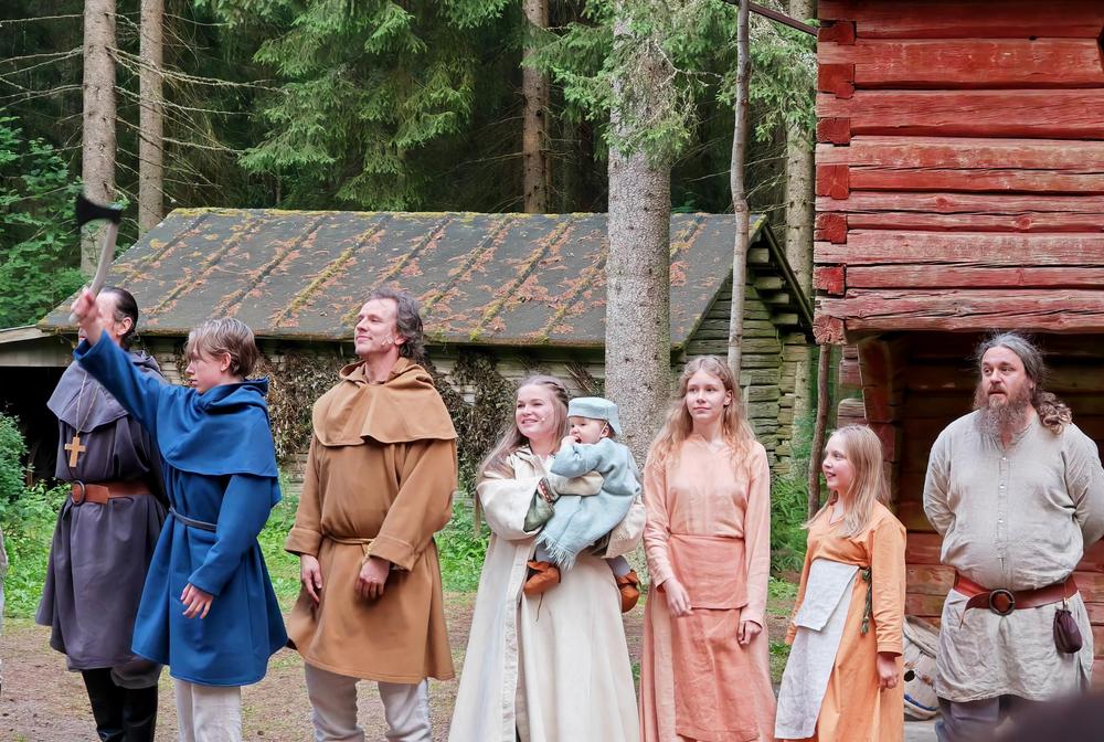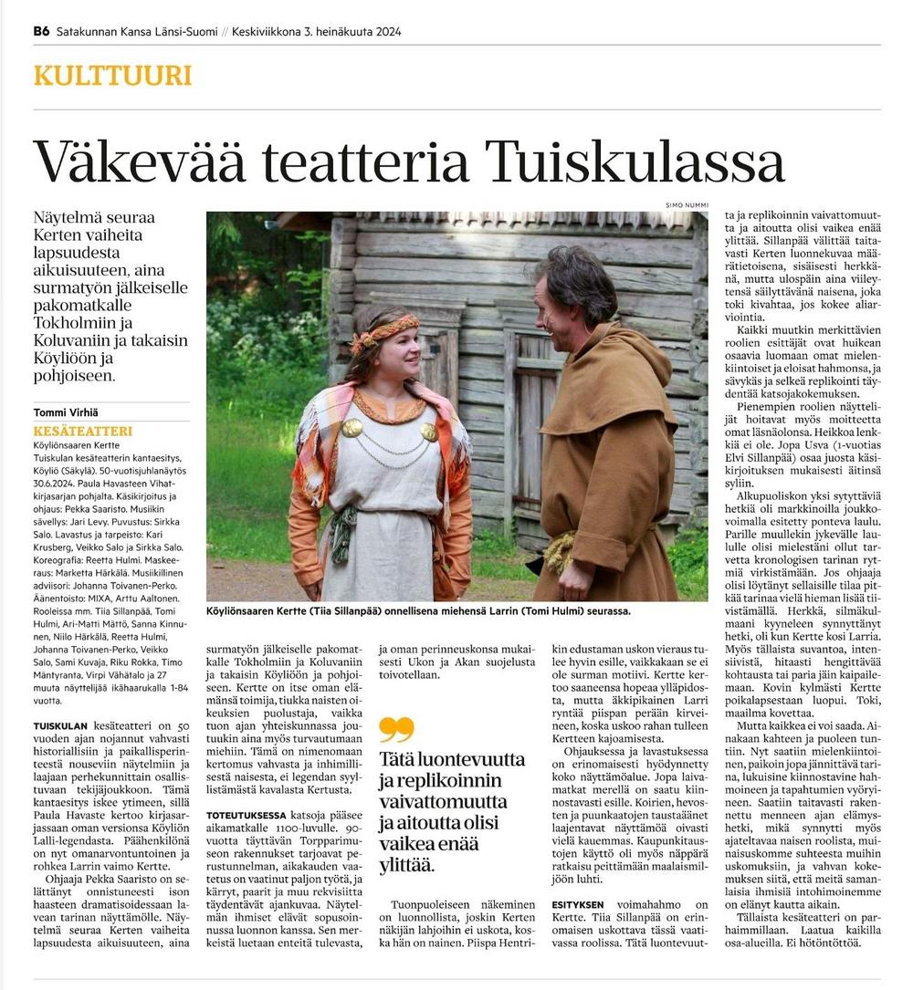 Esitys oli todella hyvä, mukaansatempaava aikamatka 1100-luvulle ja loistavasti esitetty ja toteutettu, ohjaus, lavastus, puvustus… Mukana noin 50 vapaaehtoista harrastajateatterilaista, ikähaarukka yhdestä vuodesta 84 vuoteen. Teatterin ympäristö, vanha torpparinmäki, sopi vallan mainiosti esityksen kehykseksi.