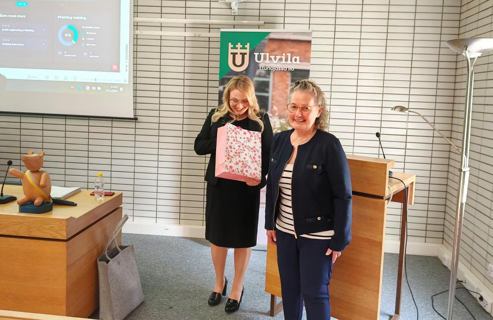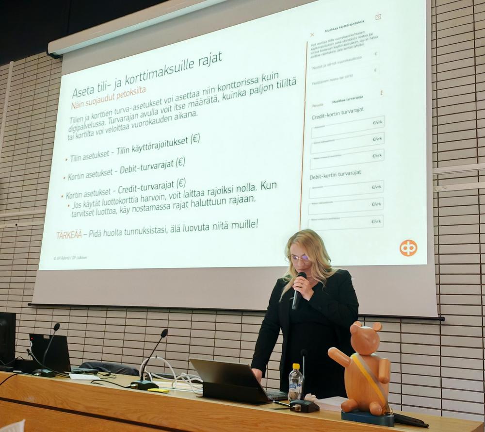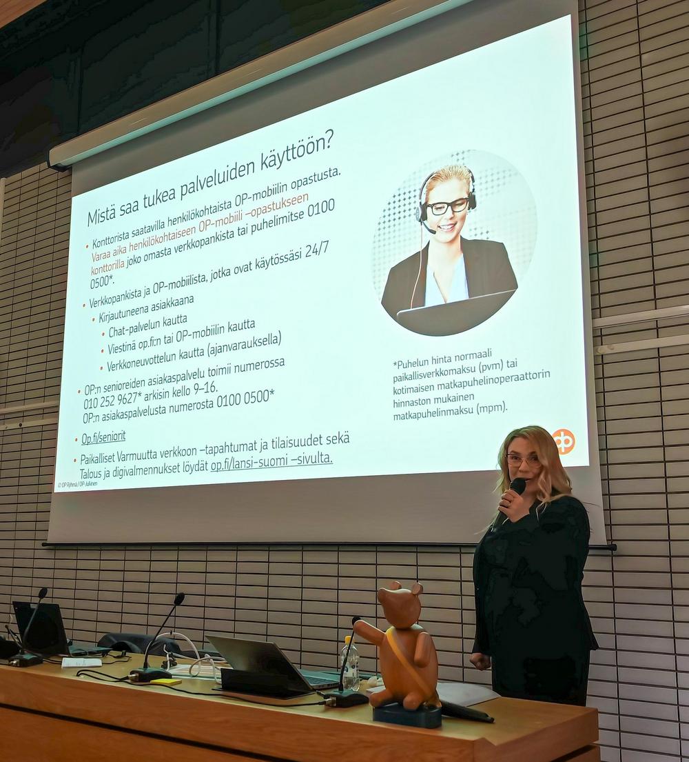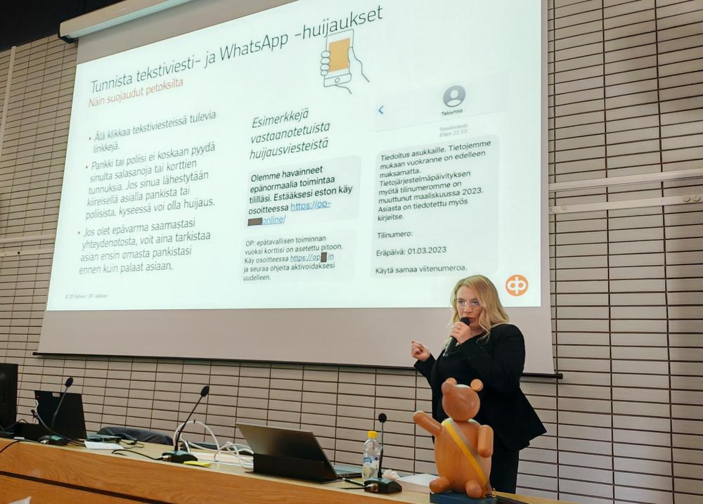 Aloitimme tapaamisen perinteisesti kahvittelun merkeissä. Aihe ’Tietoturva ja digihuijaus’ kiinnosti jäseniämme, sillä kk-tapaamiseen kaupungintalolle osallistui peräti 38 jäsentämme. Varmuutta ja vinkkejä turvalliseen verkkokäyttäytymiseen saimme OP Länsi-Suomen asiakkuuspäällikkö Maria Pitkäsen esitelmästä. Varmista saamiesi postien ja viestien alkuperäinen lähettäjä. Samoin varmista mitä linkkejä nettiselaimella olet avaamassa. Älä avaa tuntemattomien posteja, etenkään viesteissä olevia linkkejä. Ole tarkkana raha-asioissa, aseta tileihin käyttörajoitukset ja kortteihin turvarajat. Ja pidä huolta etenkin pankkitunnuksistasi! Älä luovuta niitä kenellekään. Valppaus on valttia. Maria Pitkänen sai kiitokseksi ja muistoksi vierailusta Käsis-kerhomme tuotekassin, kerhon tuotteita kylmenevään syksyyn.