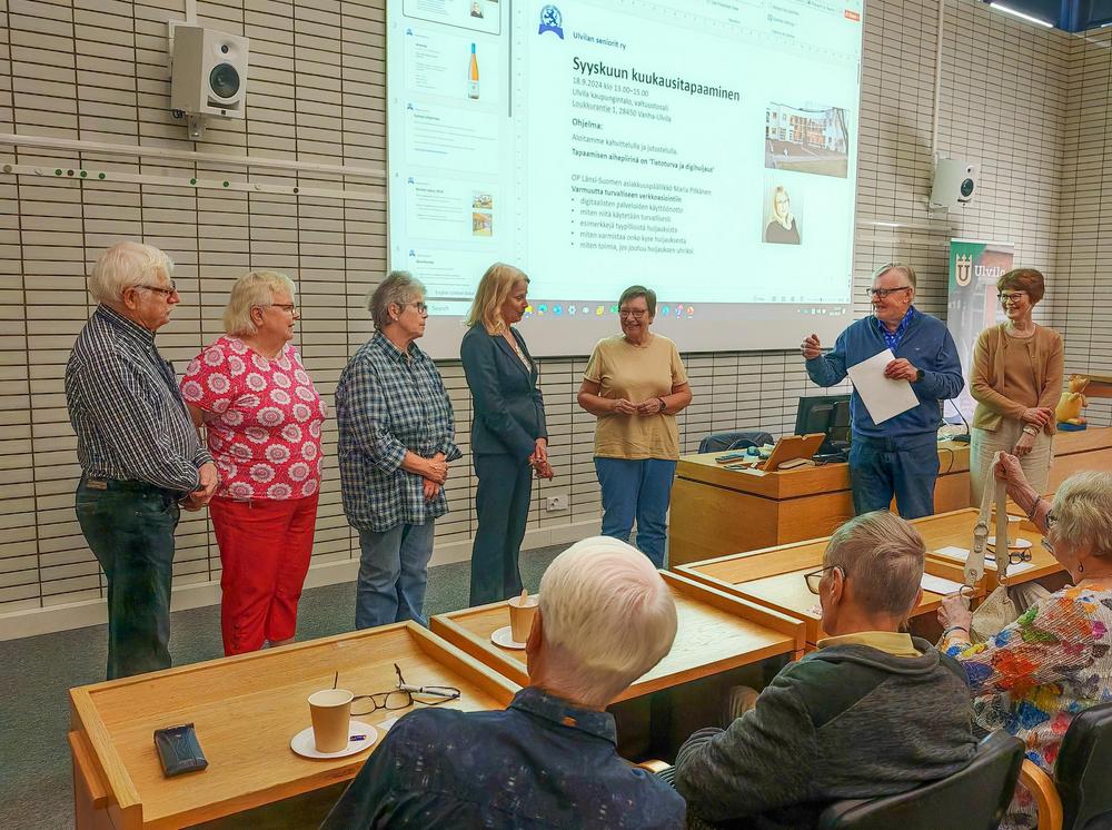 Sen jälkeen toivotimme uudet jäsenemme tervetulleiksi. Esittelimme itsemme ja uudet jäsenemme saivat myös kertoa muutamalla sanalla itsestään. Annoimme heille myös senioripinssin. Lopuksi Oili Roine kertoi jäsenrekisteripäivityksestä sekä uudesta SenioriApista. Tapaamisen päätteeksi suoritimme arvonnan.
