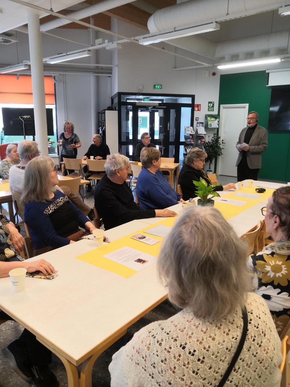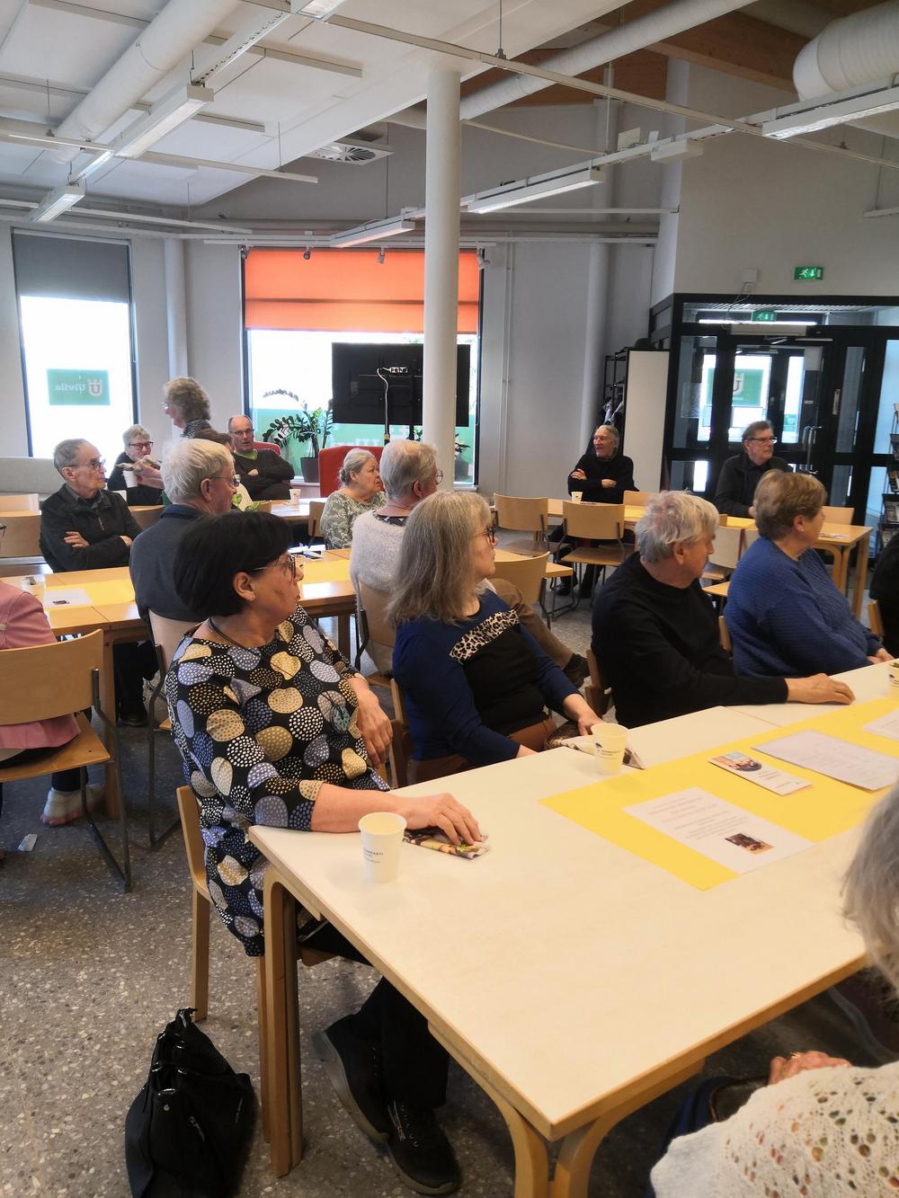 Huhtikuun kokoontumisessa oli 25 osallistujaa. Kokoontuminen aloitettiin perinteisesti kupposella kahvia ja Ainon loihtimaa tarjoilua.