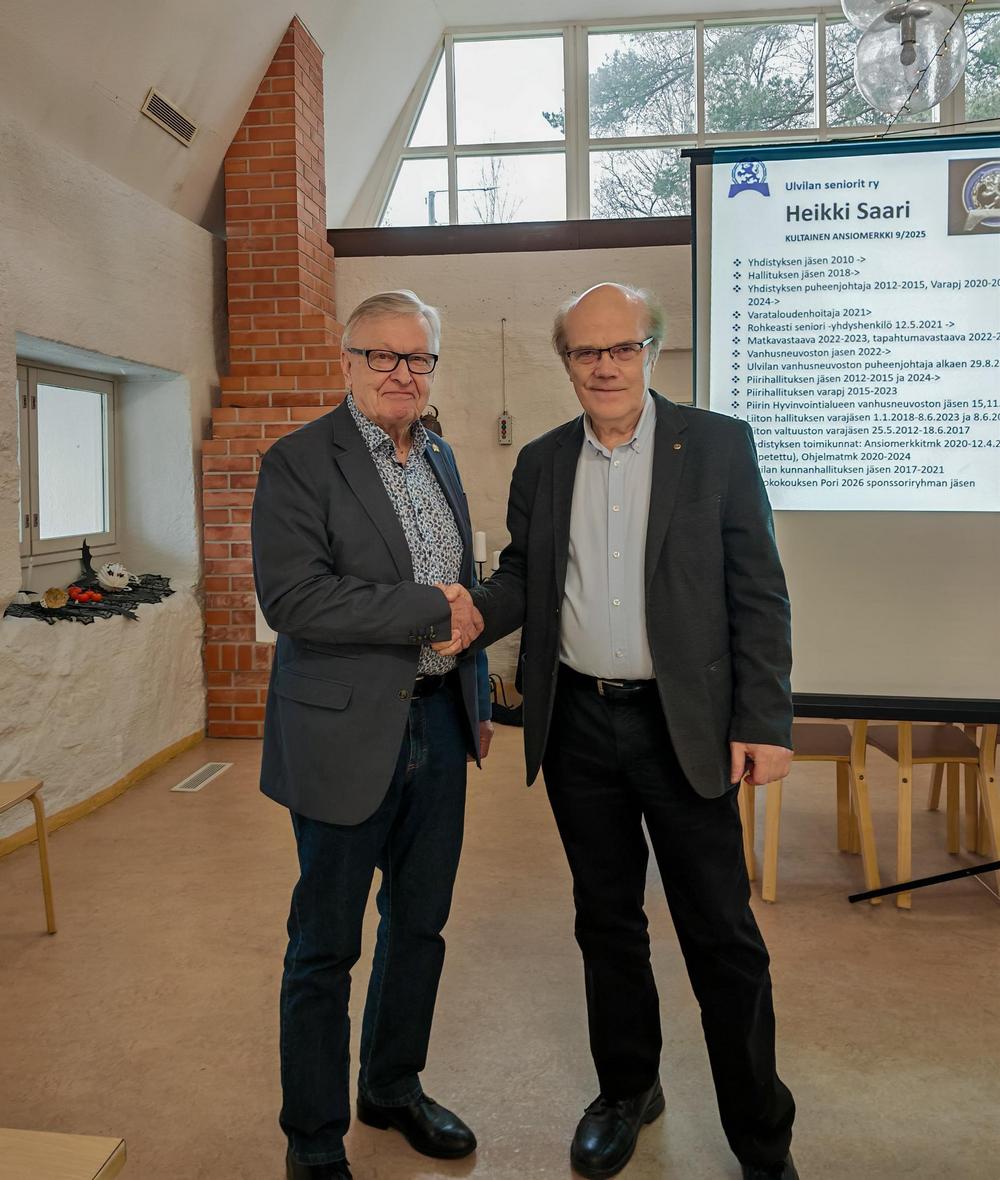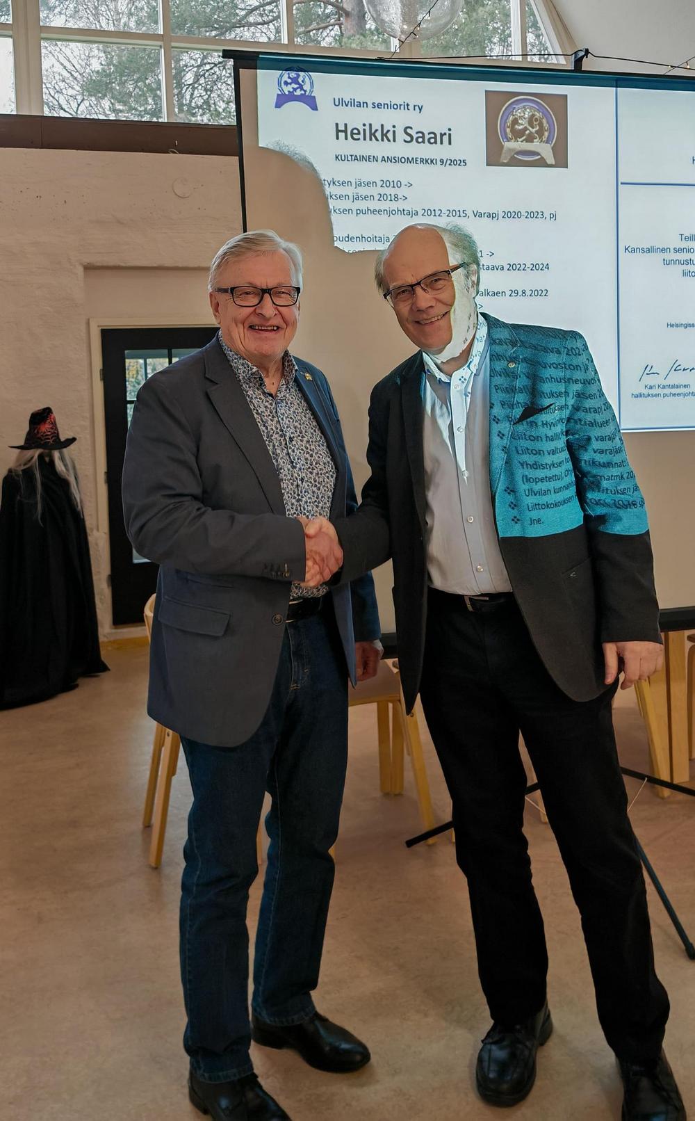 Lopuksi luovutimme kultaisen ansiomitalin nykyiselle puheenjohtajallemme Heikki Saarelle. Hän liittyi jäseneksi v 2010 ja pääsi tuolloin heti ’tositoimiin’ eli on ollut sekä yhdistyksen että piirin ja liiton toiminnoissa mukana. Iso kiitos Heikille!