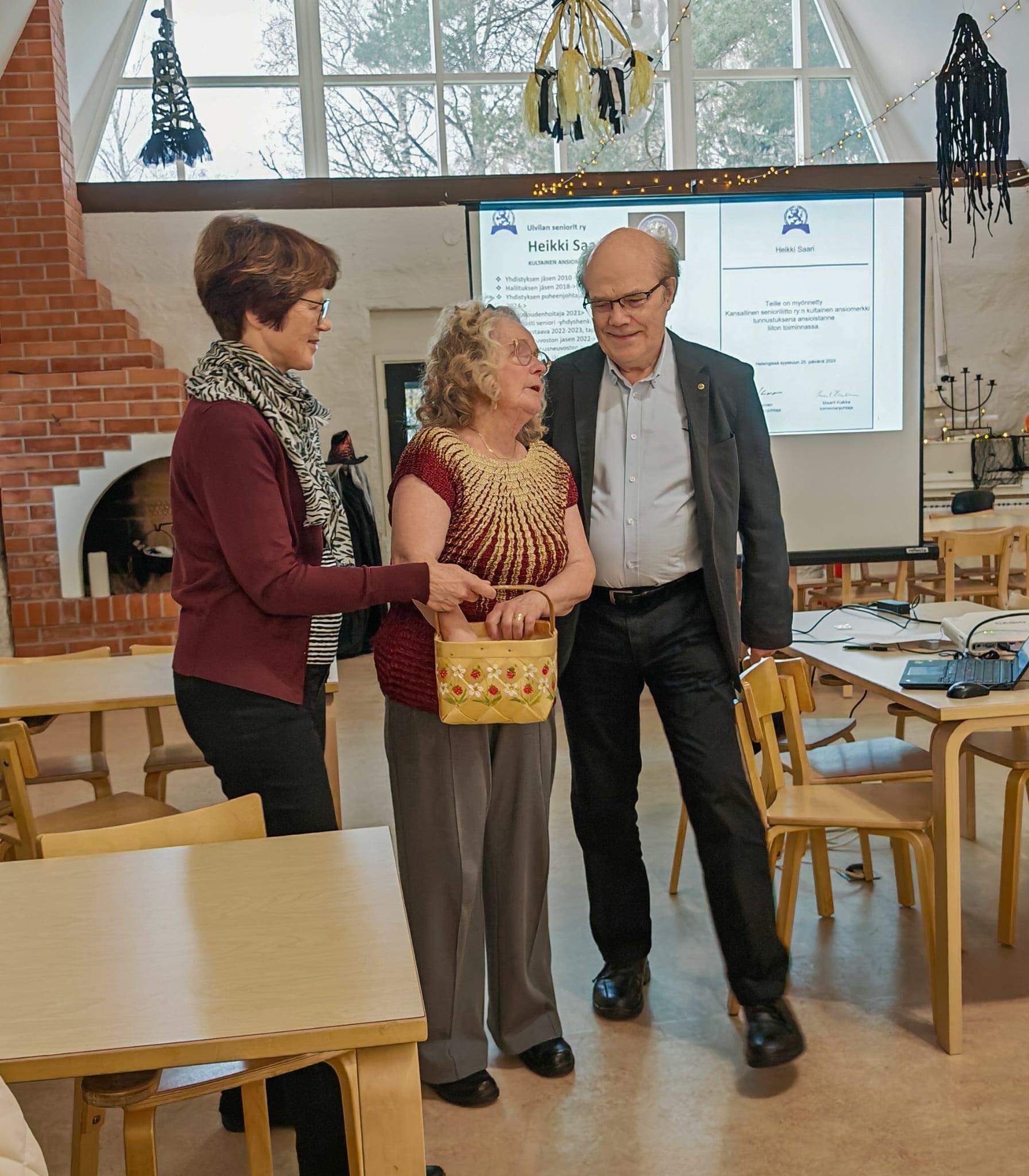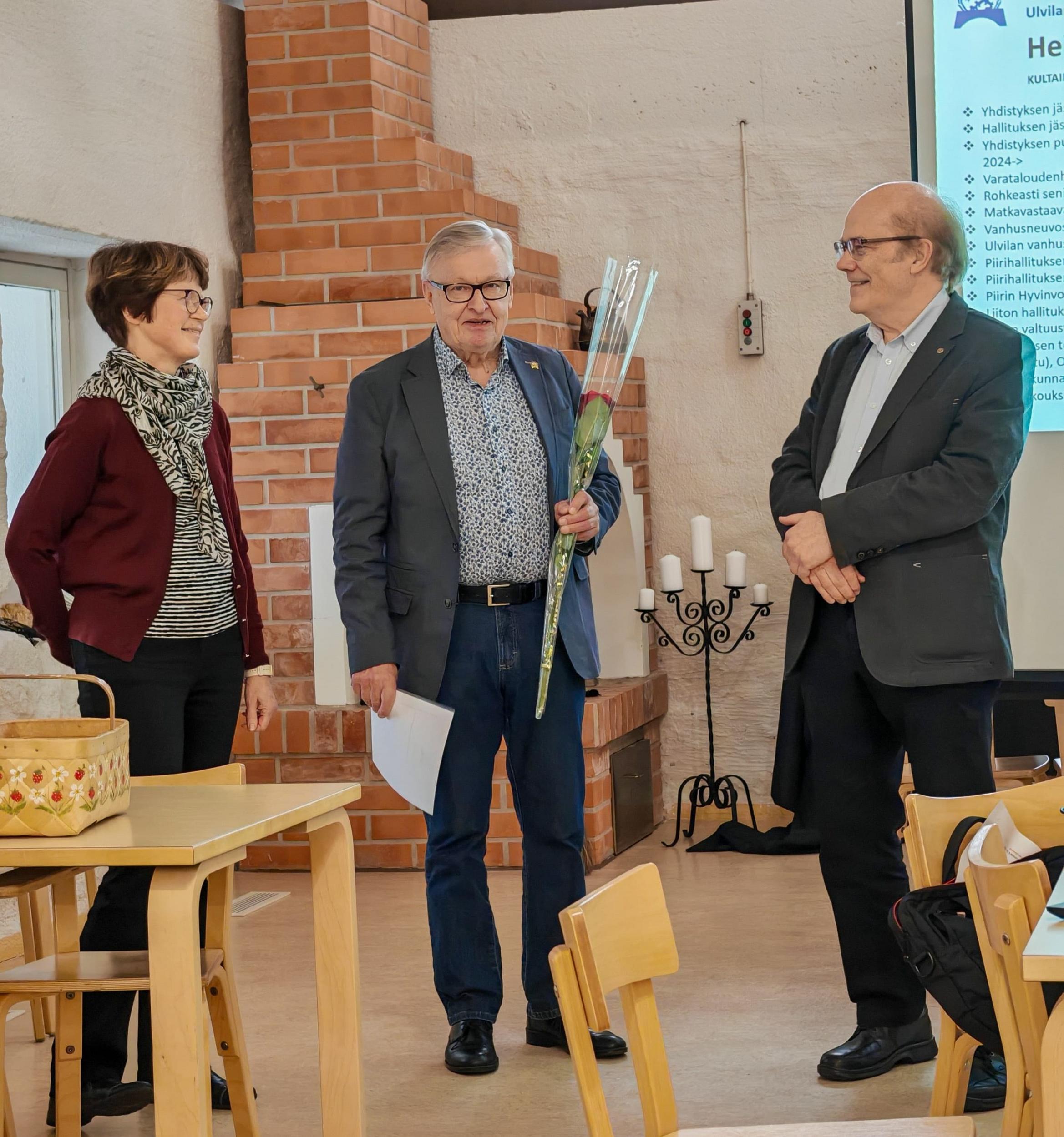 Lopuksi luovutimme kultaisen ansiomitalin nykyiselle puheenjohtajallemme Heikki Saarelle. Hän liittyi jäseneksi v 2010 ja pääsi tuolloin heti ’tositoimiin’ eli on ollut sekä yhdistyksen että piirin ja liiton toiminnoissa mukana. Iso kiitos Heikille!