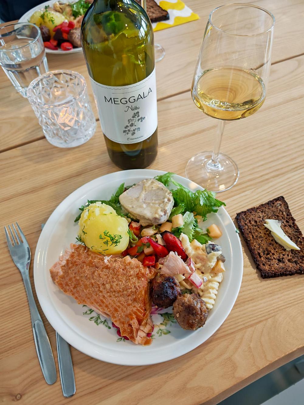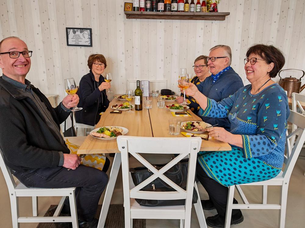 Vierailun kruunasi runsas ja herkullinen buffet-pöytä jälkiruokineen – kaikki lähiruuasta itse valmistettua. Ruuan kanssa maistelimme talon viinejä, joita hankimme myös kotiin tuliaisiksi. Kaiken kaikkiaan päivä oli todella mukava, mielenkiintoinen ja inspiroiva kokemus.